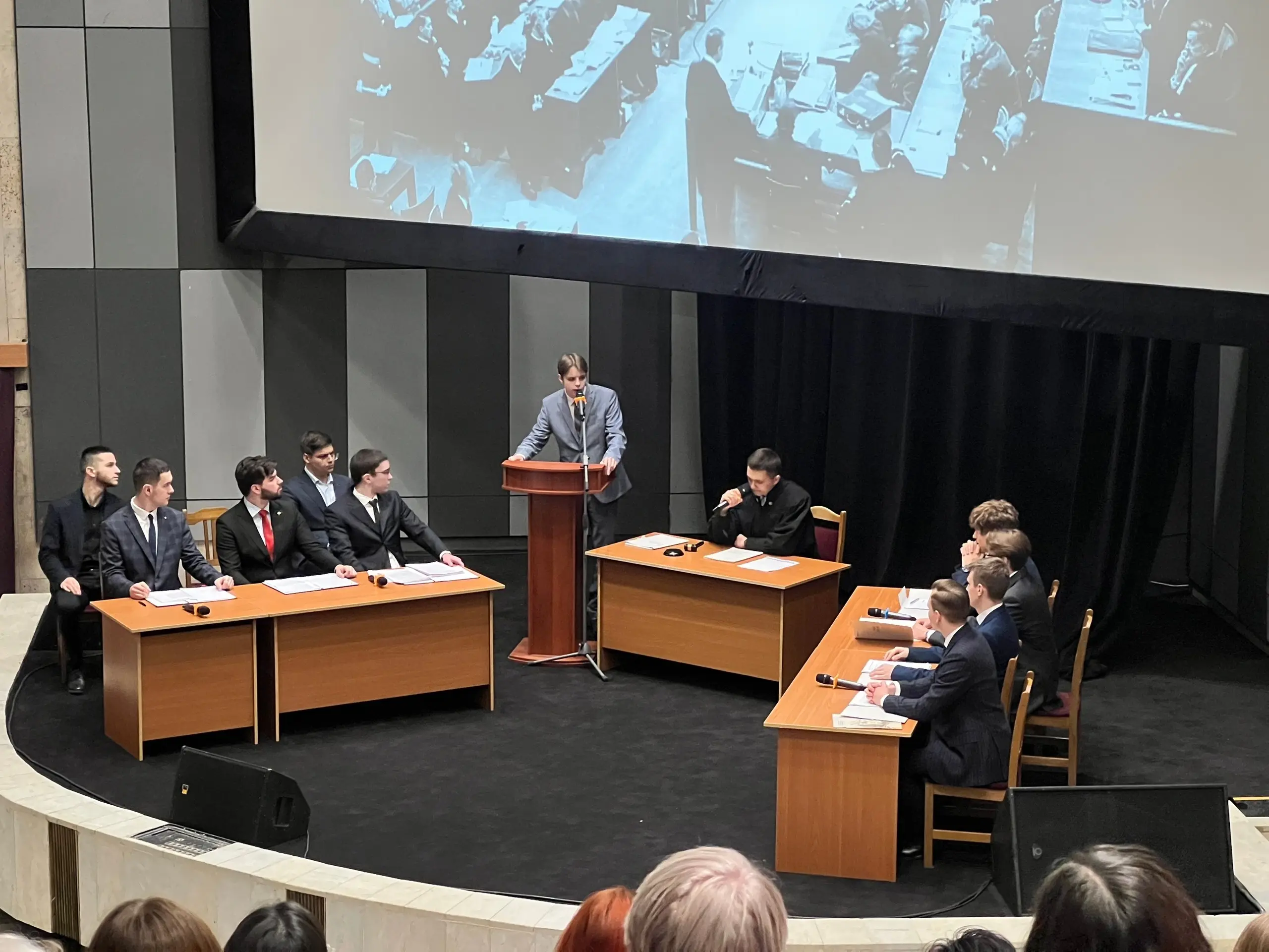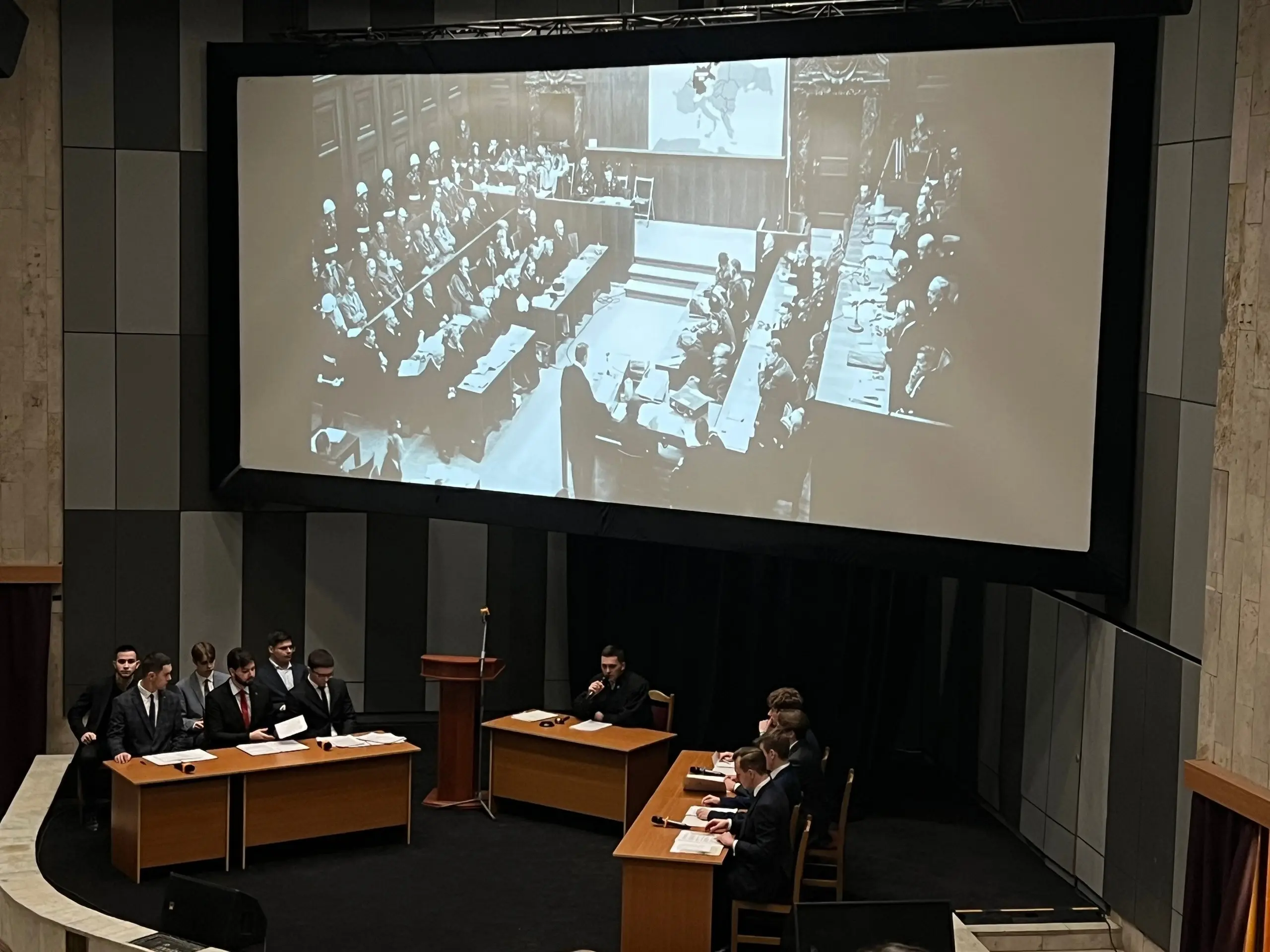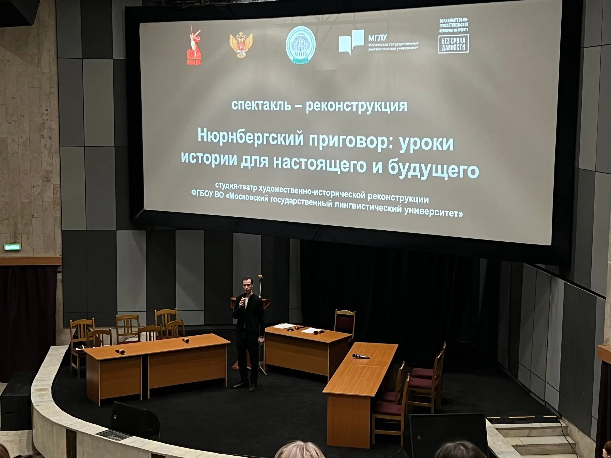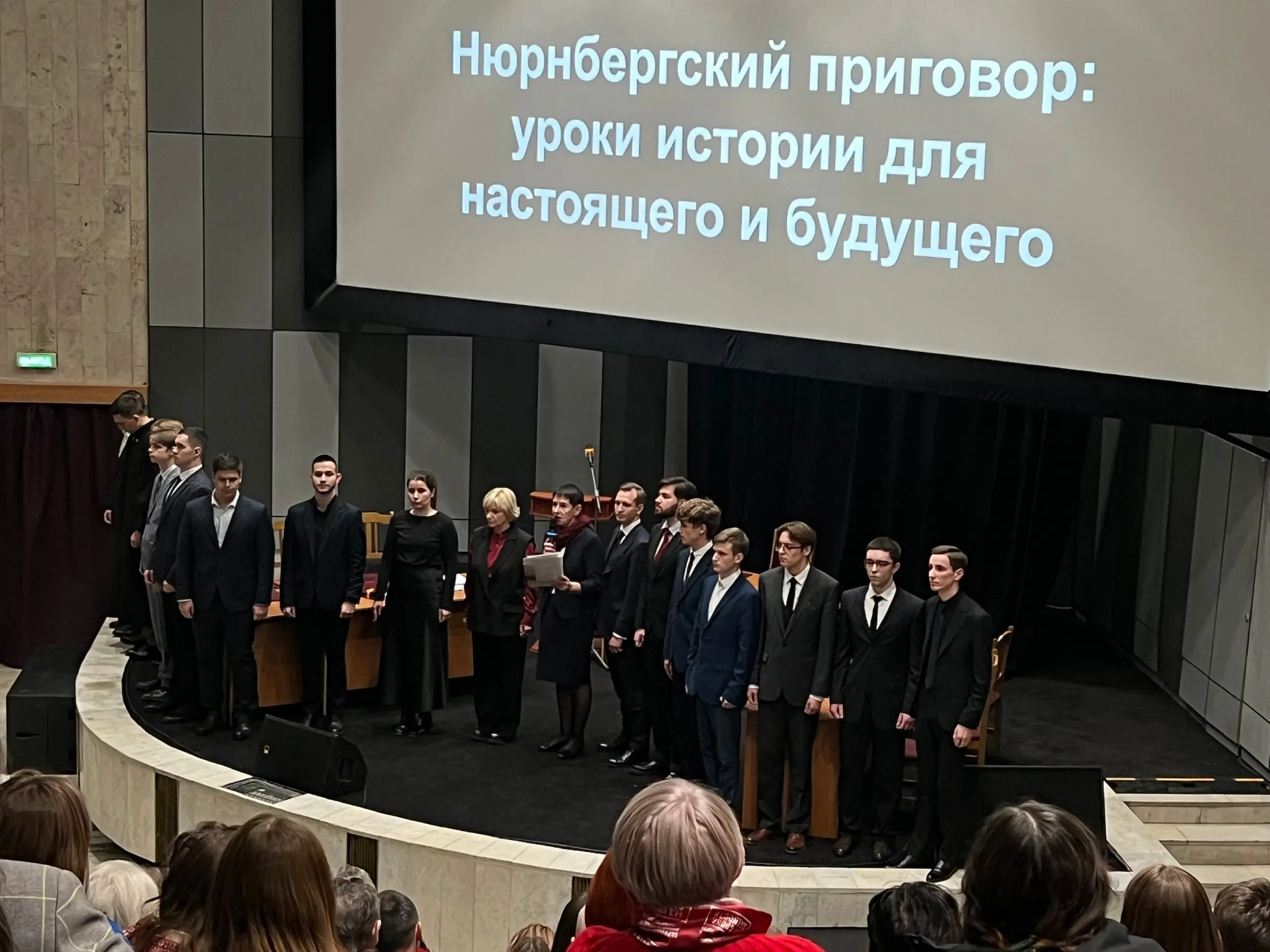 После экскурсионной программы участники финальных мероприятий стали зрителями спектакля-реконструкции «Нюрнбергский процесс: уроки истории для настоящего и будущего», подготовленного студентами Московского государственного лингвистического университета. Как и в Нюрнберге, подсудимые, судьи, обвинители и сторона защиты выступали на четырех языках – английском, французском, немецком, русском. Участники финальных мероприятий отметили высокий профессионализм преподавателей и студентов, подготовивших спектакль, и выразили слова благодарности артистам театра-студии МГЛУ.
