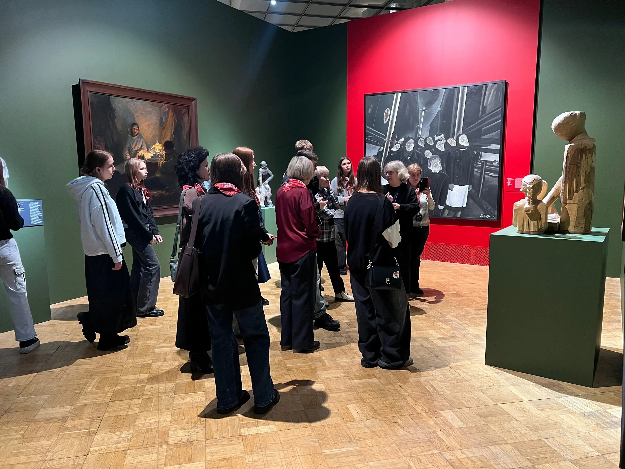 Гости столицы в Третьяковской галерее посетили с экскурсионной программой выставку «1418 дней. К 80-летию Великой Победы». В экспозицию включены пять разделов: «Огненные версты войны», «Алтарь Победы», «Эхо прошедшей войны», «Лица Победы» и «Третьяковская галерея в годы Великой Отечественной войны, - каждый из которых рассказывает о ключевых моментах того времени. В фондах Третьяковской галереи хранится уникальное по составу и количеству экспонатов собрание произведений, посвященных теме Великой Отечественной войны, большая часть которого представлена в рамках выставки. Всего на выставке показано более 250 произведений, хранящих в себе память о Великой Отечественной войне и подвиге народов советских людей.