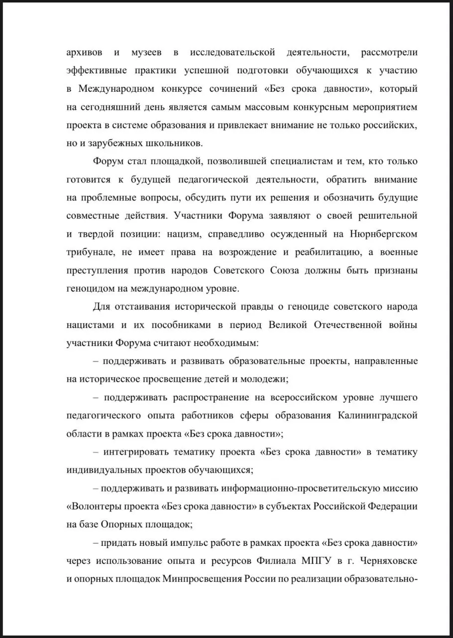 На итоговой конференции 25 сентября 2025 года принята РЕЗОЛЮЦИЯ Международного форума «Проект «Без срока давности». Ключевые приоритеты и ценностные ориентиры для молодого поколения».