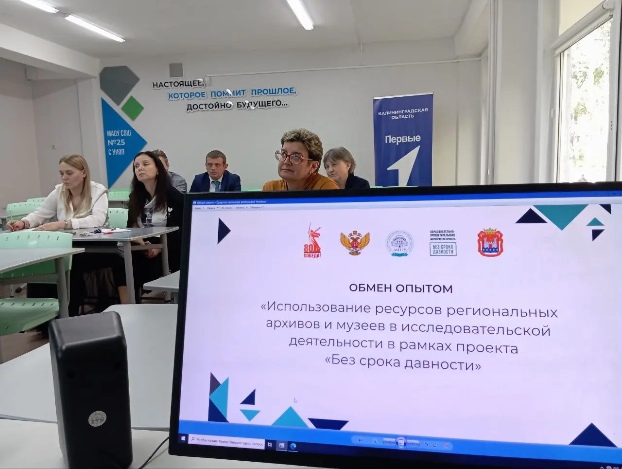 В рамках работы площадки по обмену опытом в средней школе 25 г. Калининграда выступили заместитель главного редактора Военно-исторического журнала Владимир Кикнадзе и ведущий специалист Управления общественных проектов МПГУ Антон Саенко. Они подробно осветили проблемные вопросы изучения военных преступлений, преступлений против человечности, геноцида советского народа нацистами и их пособниками в период Великой Отечественной войны, а также представили систему образовательно-просветительских мероприятий проекта «Без срока давности». Педагоги выразили большую заинтересованность конкурсными мероприятия проекта и методическими пособиями, изданными МПГУ.